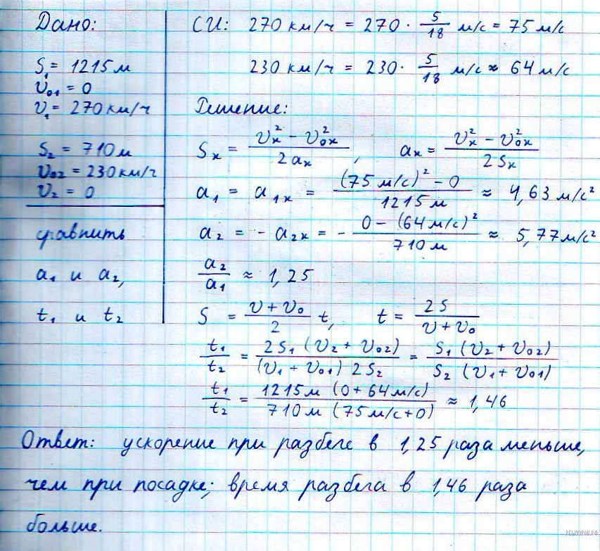 Версия для печати и копирования в MS WordДлина разбега при взлете самолета Ту−154 равна 1215 м, а скорость отрыва от земли 270 км/ч. Длина пробега при посадке этого самолета 710 м, а посадочная скорость 230 км/ч. Сравнить ускорения (по модулю) и время разбега и посадки.